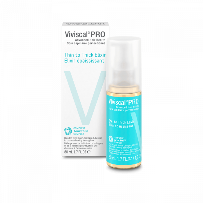 Viviscal Professional Elixir promotes thicker-looking hair as part of the complete Viviscal Professional Thin to Thick hair care collection. Only Viviscal hair care contains Ana:Tel™, a proprietary complex that includes clinically tested ingredients derived from natural sources, such as pea sprouts and grape seeds. Combined with Biotin, Collagen & Keratin, the Viviscal Professional Thin to Thick hair care collection promotes the appearance of healthy looking hair growth*.